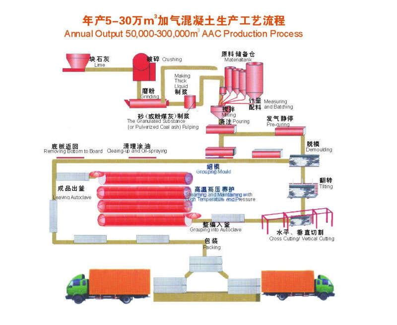 The lime, cement will convey by conveyor to the dry powder measure scale to scale separately. The slurry convey by slurry pump then to the automatic scale;the power and slurry put into the mixer,pouring into the mould.